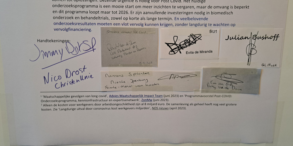 Zeven politieke partijen; Bij1, ChristenUnie, GroenLinks-PvdA, SP, Splinter, Partij van de Dieren en Volt hebben het stembusakkoord getekend van PostCovid NL, Long Covid Nederland, #NietHersteld en Kinderen met Long Covid. In het stembusakkoord pleiten wij onder meer voor meer erkenning en bewustwording, een betere toegang tot specialistische zorg, daarnaast willen we ook dat aanvullende investeringen nodig zijn in biomedisch onderzoek en behandeltrials, zowel op korte als lange termijn.